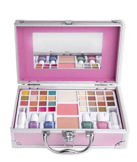 Este estuche todo en uno ofrece 24 sombras de ojos, 6 brillos labiales, 4 esmaltes de uñas, 2 rubores y bronceadores, 2 barras de labios y 3 polvos, brindando una amplia gama de colores y productos versátiles. Ya sea que estés viajando o necesites una solución de belleza todo en uno, esta colección compacta tiene todo lo que necesitas.