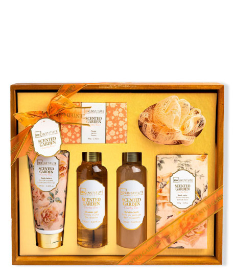 - Gel 150ml + Espuma de Baño 150ml + Loción Corporal 100ml + Sales de Baño 150g + Jabón 80g + Esponja