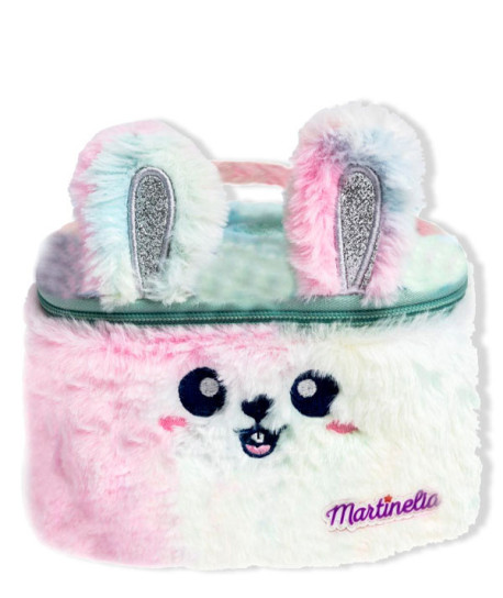 Esta adorable bolsa está adornada con orejas de conejo y guarda tesoros como 2 labiales, 1 paleta de sombras de ojos, 2 esmaltes de uñas, 1 anillo y 1 separador de uñas.
