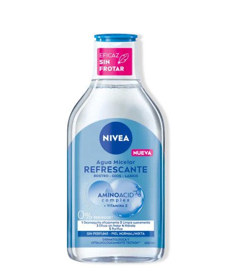 NIVEA Agua Micelar Refrescante Piel Normal / Mixta, especialmente formulada para piel normal o mixta, elimina el maquillaje, hidrata y purifica la piel sin dejar residuos.